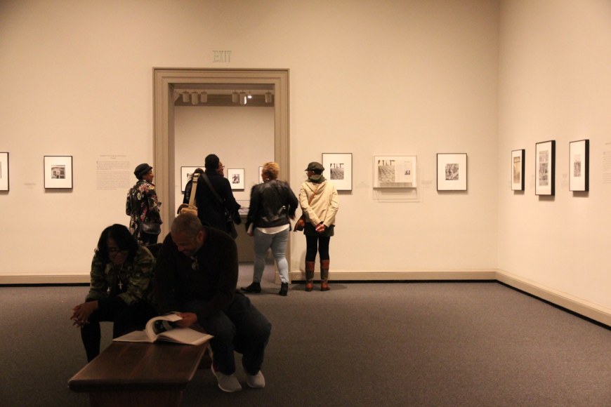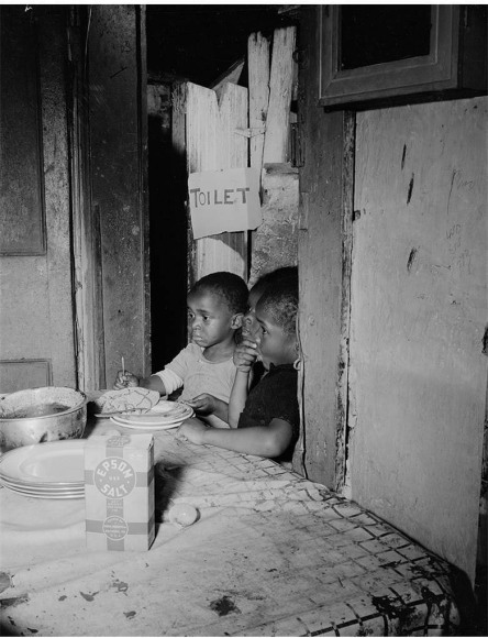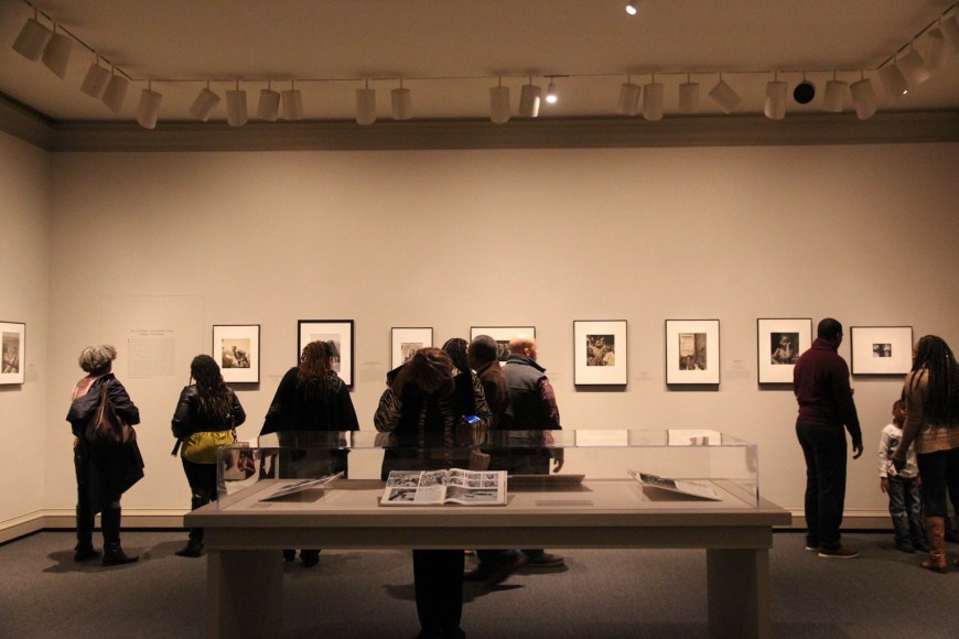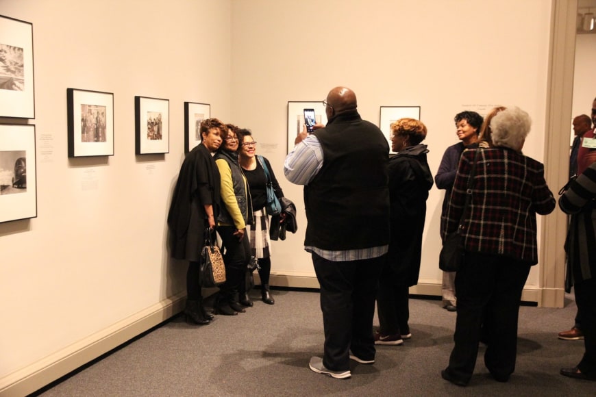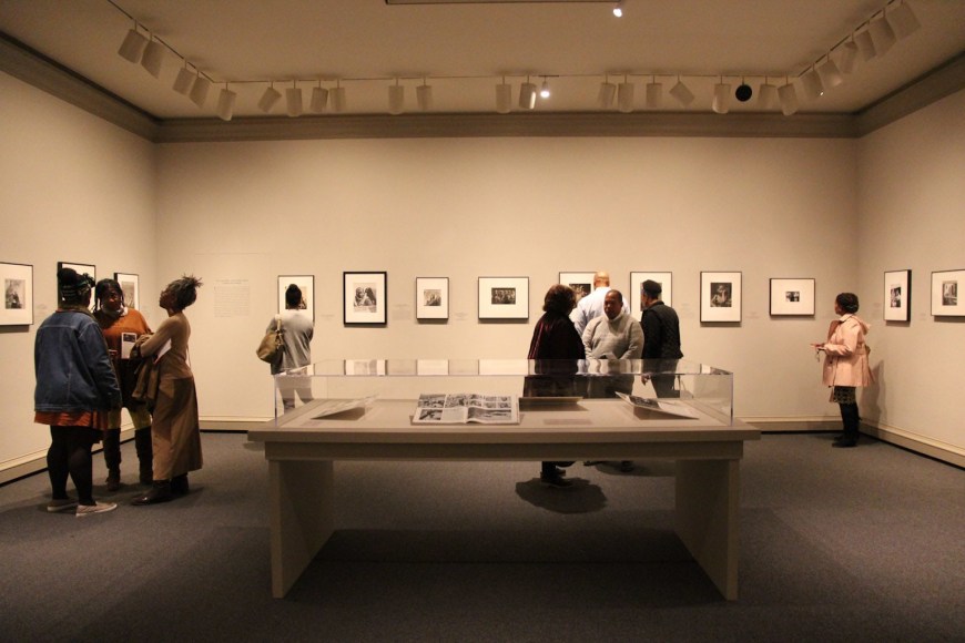 Gordon Parks: The New Tide is divided into five sections. The first, A Choice of Weapons (1940–1942), opens with some of the elegant society portraits that established Parks’s career as a professional photographer in Saint Paul and Minneapolis. After moving with his wife and two children to Chicago in early 1941, Parks was given access to studio space and a darkroom in the South Side Community Art Center (SSCAC). Recently established with support from the Works Progress Administration’s Federal Art Project, the SSCAC was the epicenter of Chicago’s African American art scene. In addition to earning a decent living by taking portraits of the city’s middle- and upper-class African American community, Parks documented SSCAC activities, including its May 1941 dedication with First Lady Eleanor Roosevelt in attendance. He developed relationships with other artists—many who taught at the center—such as Eldzier Cortor, Margaret Taylor Burroughs, and Charles White. The latter, a painter, encouraged Parks to take his camera onto the streets to document the surrounding South Side neighborhood. This section also includes Parks’s portraits of influential figures, such as SSCAC director Peter Pollack, renowned poet and playwright Langston Hughes, philosophy professor and architect of the New Negro movement Alain Locke, and opera singer Todd Duncan.