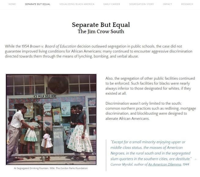 Mae’s project focuses mainly on Gordon Parks’ depiction of segregation in the South during the Jim Crow era. In response to the Montgomery bus boycotts, Life magazine assigned Parks to document families living under segregation in Alabama in 1956. By blending together letters to the editor from Life Magazine, photographs by Parks, and quotes from scholars and Parks himself, Miss Goodrich creates an immersive, educational viewing experience that communicates the impact that Gordon Parks had on the portrayal of segregation in the media. As she states rather elegantly in her introduction, “His photographs supported the Civil Rights Movement by portraying blacks as capable, intelligent people rather than agitators or victims. Parks’ humanistic representation of African Americans expanded the range of images available to the public about the everyday inequities blacks faced, which led to a more empathetic understanding and greater acceptance of them.”