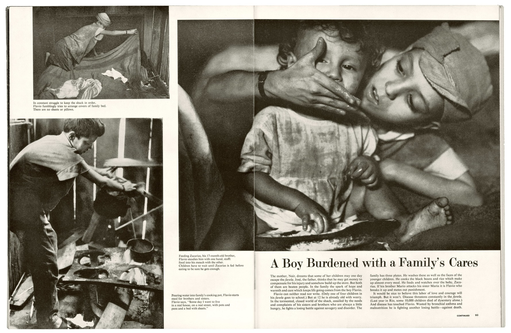 Parks spent weeks documenting the lives of Flavio and his family, recording the filth in which they lived, the daily pain they endured, and moments of laughter and tenderness they shared. In the process, he learned that Flavio was suffering from severe bronchial asthma and was not expected to live more than another year. After a moving good-bye, Parks returned to New York and presented his story to the editors at Life. He expected that it would merit the magazine’s cover, but when the preliminary layout for the article appeared, he was shocked that it contained only a single photo of Flavio. Parks immediately typed up his resignation letter. Fortunately, for Parks and Flavio alike, the editors reconsidered, and the story—“Freedom’s Fearful Foe: Poverty”—was published across ten full pages on June 16, 1961. The piece generated an enormous response from Life readers, garnering enormous praise for Parks and galvanizing the public to send enough money to the da Silva family to move from the favela. Within a month, $30,000 had been donated, giving Parks the means to return to Brazil, relocate the da Silvas, and help Flavio obtain the medical attention he desperately needed. After a turbulent reunion in Rio and an uneasy departure for the United States, Parks himself delivered Flavio to the Children’s Asthma Research Institute and Hospital in Denver for treatment of his debilitating condition. The photographs of the two reveal the degree to which Parks held himself personally responsible for the well-being of the boy, and anticipate the tender but troubled connection they would maintain through letters and visits for the rest of their lives.