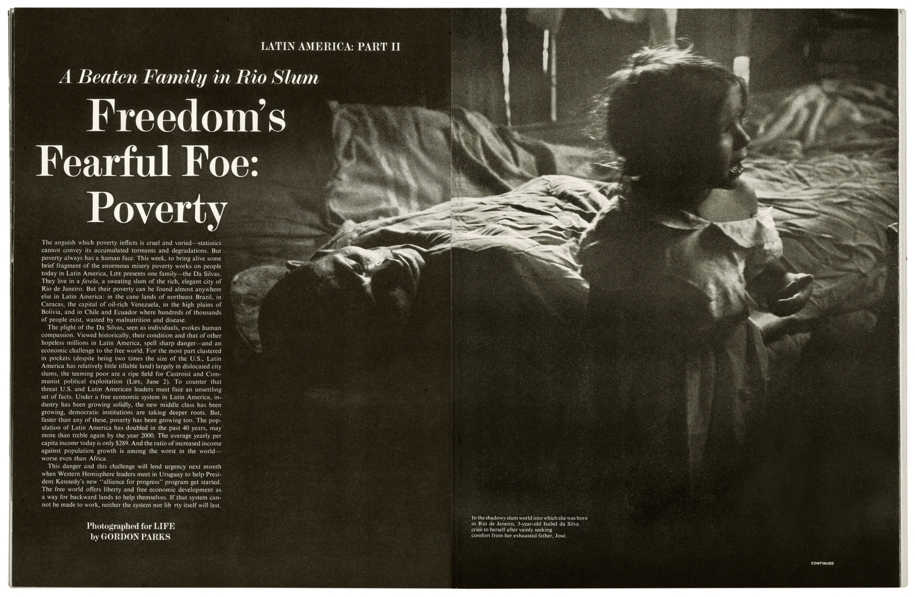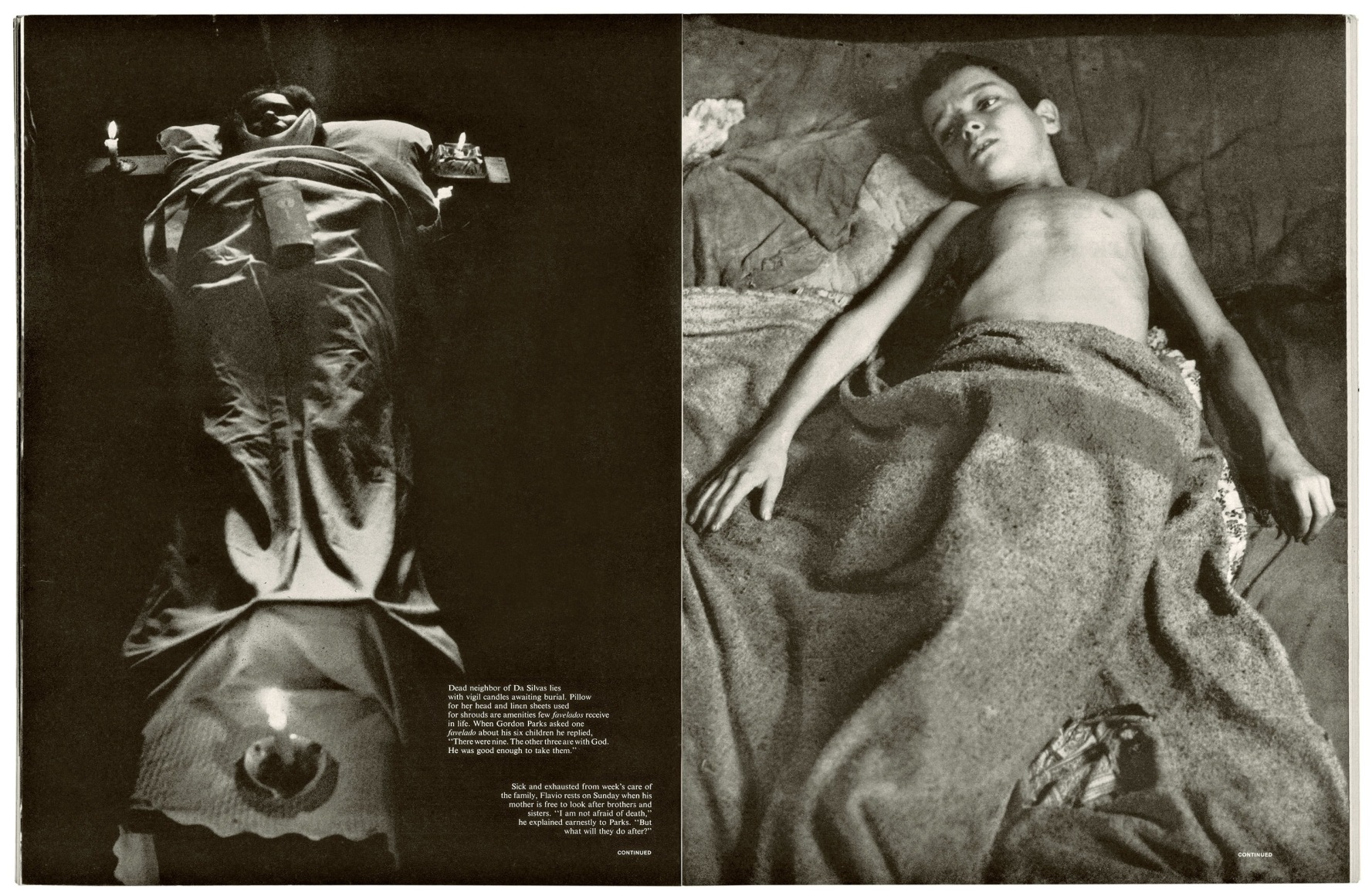 In 1961, Life sent Parks to Brazil to shoot a story on poverty in Latin America, concentrating on the favelas, the infamous hillside slums of Rio de Janeiro. At the time, these were home to more than 700,000 people. In one favela, called Catacumba, or Catacomb, death seemed to close in from all sides. The place was riven by malnutrition and disease; open sewers ran between pitiful shacks. Despite his familiarity with poverty, Parks was shocked by the conditions: “Pockets of poverty in New York’s Harlem, on Chicago’s south side, in Puerto Rico’s infamous El Fungito seemed pale by comparison. None of them had prepared me for . . . the favela of Catacumba” (Voices in the Mirror, 1990).