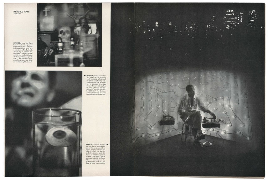 Parks also re-created a passage from the novel in which the narrator’s hole in the ground is illuminated with 1,369 lights. “I doubt if there is a brighter spot in all New York than this hole of mine,” the narrator claims, “and I do not exclude Broadway.” In a composite print, Parks conjures this juxtaposition of light and dark by combining a night vista of the city with a reconstruction of the uniquely illuminated room described in the novel. Such staging testifies not only to the book’s deep impression on him, but also to Parks’ expanding vision and invention around this time. The following year, he would compose his first piano concerto, and his efforts to craft narrative would flourish soon after in the realm of film.