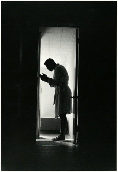 While the initial images in the 1970 article express the ferocity the twenty-eight-year-old boxer brought to his training, Parks again evinced sympathy for Ali through disarming images of him glancing wide-eyed in the locker room, posing surrounded by young fans in a Miami restaurant, and taking a mid-afternoon nap after training.