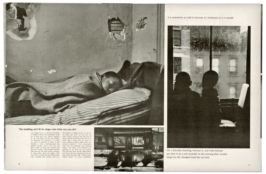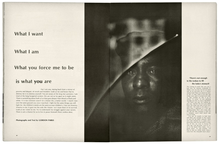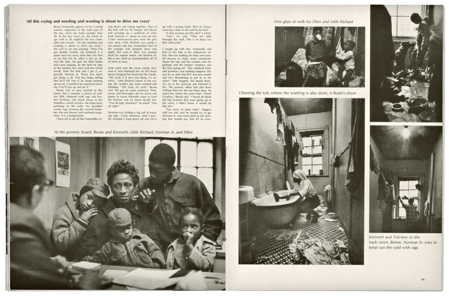 The scene Parks presented to Life readers was perhaps more disturbing than his piece on the Brazilian boy Flavio da Silva and his family seven years earlier; after all, it came from a place far closer to home, and chronicled a story just as gruesome. With winter approaching, British West Indies immigrant Norman Fontenelle, Sr., and his wife, Bessie, were falling short in their efforts to scrape together enough to feed their nine children. Jobless and frustrated, Norman Sr. would drink and then beat Bessie. With no food to offer, Bessie could not prevent her youngest child, three-year-old Richard, from eating the plaster that fell from the walls of their tiny dirt-covered apartment. On Thanksgiving, Parks photographed the family huddled around an empty oven, trying to stave off the cold with their only source of heat. The image selected for the cover of the March 8, 1968, issue is one of Parks’ most arresting: a wailing five-year-old Ellen Fontenelle, with a tear fully formed at the bottom of one eye, just before it descends her cheek.