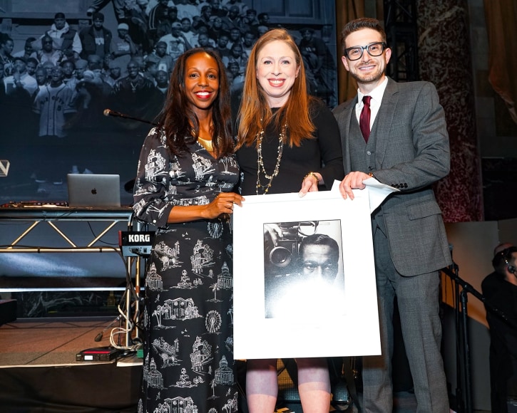 Presenters Sarah Lewis and Alex Soros with Honoree Chelsea Clinton. Photo by Sean Zanni for PMC.